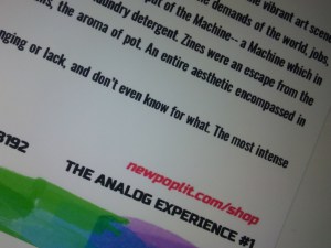 We’ve begun exploring ideas behind new analog culture (vinyl, zines, film) in a newsletter, The Analog Experience. We’ll soon send copies to our “prestige” customers– those who’ve purchased three or more of our zeens. BUT you can subscribe to four issues now at our POP SHOP.