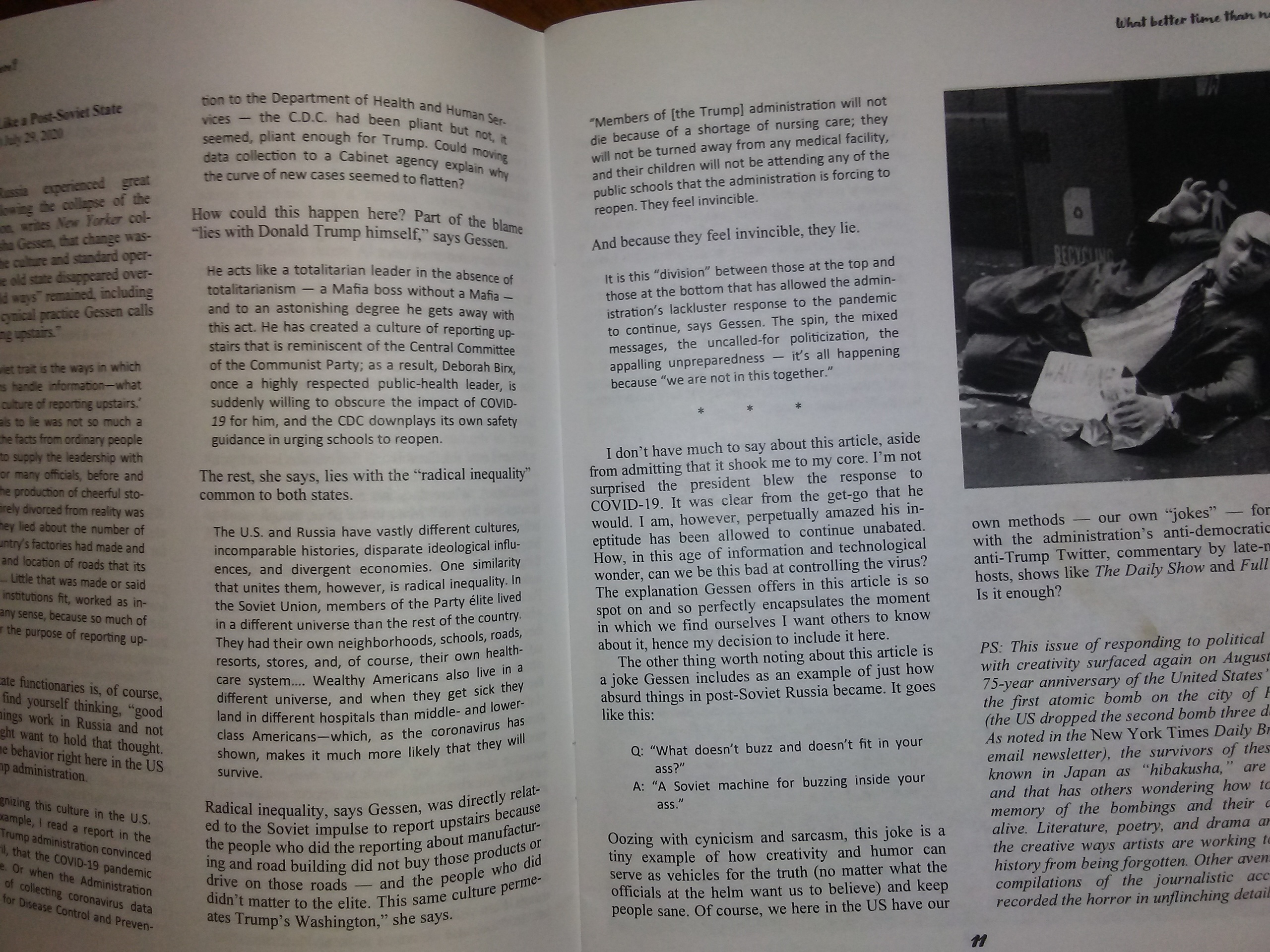 Why is this important? Because print underground literature is an actual alternative– samizdat!— a free space of ideas not subject to self-appointed hall monitors and censors. Breaking the hive mind. No bureaucrats, official or unofficial. In the tradition of Thomas Paine, Davy Crockett, Walt Whitman, Stephen Crane, Robert McAlmon, the Beats– and including Alexander Solzhenitsyn and a host of other international samizdat writers. The genuine article. The authentic American yawp.